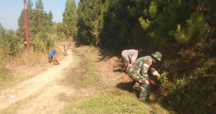 Terpantau di lokasi terlihat Babinsa dan warga sekitar dengan menggunakan peralatan seperti cangkul untuk mengangkat tanah yang ada di saluran air