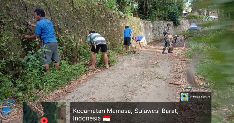 Mamasa, - Bintara Pembina Desa Koramil 1428-01/Mamasa Serka Daenmengge bersama warga gotong royong membersihkan lingkungan dalam rangka menyambut hari Natal dan tahun baru di Desa Pebassian Kecamatan Mamasa Kabupaten Mamasa, Sabtu (06/12/2025).